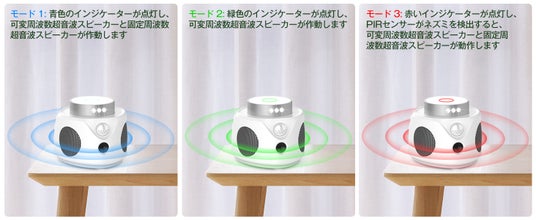 インジケーターの色で作動モードを簡単に確認できます。青色インジケーターで可変・固定周波数の超音波が作動し、緑色インジケーターでは可変周波数のみが作動。赤色インジケーターでは自動モードが起動し、ネズミが検出されると超音波が即座に発動します。LED点滅ライト機能も、手動でのON/OFFが可能です。