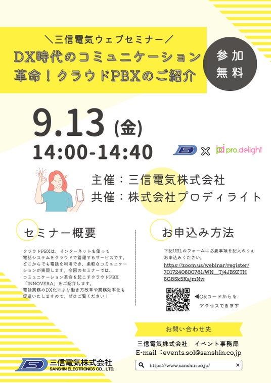 電話のDXを推進する株式会社プロディライト(大阪市中央区:代表取締役社長 小南 秀光、証券コード:5580、以下プロディライト)が2024年9月13日、三信電気株式会社(証券コード:8150、以下三信電気)主催のウェブセミナーでクラウドPBX「INNOVERA」を紹介します。