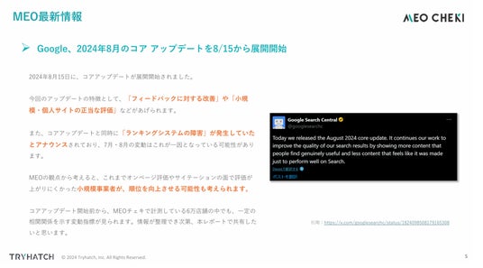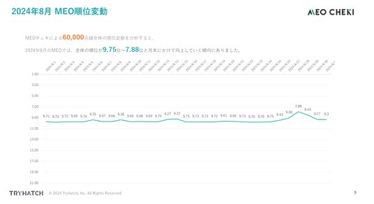 株式会社ベクトル(本社:東京都港区、代表取締役会長兼社長:西江 肇司、東証プライム:6058)の子会社である株式会社トライハッチ(東京都新宿区、代表取締役社長、武藤 尭行、以下「当社」)は、独自開発している店舗向けデジタルマーケティングツール「MEOチェキ」を活用して、MEOのアルゴリズム調査やトレンドをまとめた「MEOトレンドレポート」の2024年8月版を無料公開いたしました。