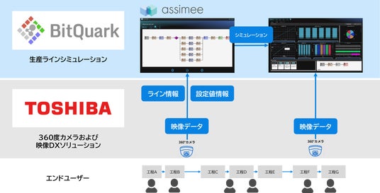 今回の協業では、このプロセスを更に効率化するために、東芝の360度カメラおよび映像DXソリューションを連携させ、映像データから生産ラインのプロセス情報やパラメーターを自動で抽出し、assimeeのシミュレーションモデル作成・更新を自動化する技術検証を行います。