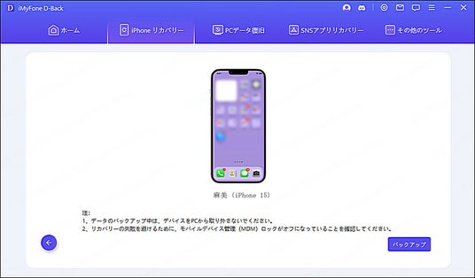 D-Backの最新バージョンでは、iOSデバイスをワンクリックでバックアップできるようになりました。iPhone/iPadをパソコンに接続して、「バックアップ」をクリックするとプロセスが開始します。また、バックアップしたコンテンツを「iTunesからリカバリー」モードでチェックできます。