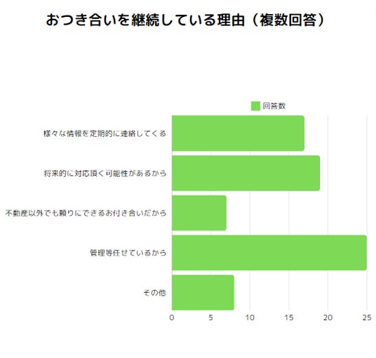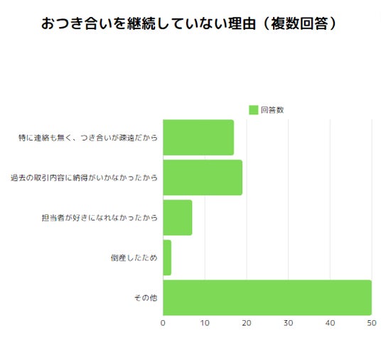 一方、継続していない理由として最も多かったのは「過去の取引内容に納得がいかなかったため」です。この結果は、短期的な契約締結の弊害として、顧客が十分な満足を得られなかった可能性を示唆しています。調査員として、取引後の顧客満足度を向上させるためには、取引時の詳細な説明やアフターフォローが欠かせないと考えます。