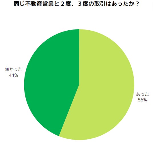 調査対象者の半数以上が、同じ不動産営業と複数回取引を行った経験があることがわかりました。再取引きを行うという消費者の行動は、営業担当者が初回取引を通じて顧客との信頼関係を築き上げた結果であると言えます。