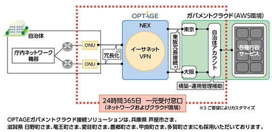 当社は従来より、インターネットと直接交わりを持たないセキュアな閉域接続サービス「イーサネットVPN」や、冗長化した閉域網によるパブリッククラウド接続サービス「ネットワークエクスチェンジ(NEX)」など、多岐にわたる接続サービスを提供しています。また、一部パブリッククラウドを24時間365日の有人体制で監視・障害対応・運用保守するサポート体制も有しており、AWS社より「ガバメントクラウド(AWS環境)運用管理補助者※2」としても紹介されています。当社はこれらの豊富なラインアップからガバメントクラウド接続に最適なサービスを組み合わせることで、自治体さまそれぞれの課題に合わせたソリューションを提案いたします。