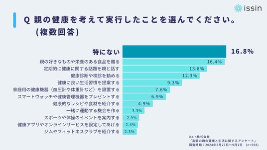 ・親の健康を考えて実行したことは「特にない」(16.8%)が最も多く、実際に会ってケアやサポートをするのが難しい状況