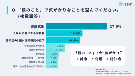 ・「親のこと」で気がかりなこと1位は「健康状態」(27.0%)、次いで「介護が必要になる可能性」(16.0%)、「認知症の兆候・認知機能の低下」(14.6%)。