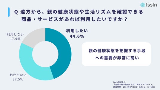 さらに約半数(44.6%)は、「遠方から親の健康状態や生活リズムを確認できる商品・サービスがあれば『利用したい』」と回答しており、親の健康状態を把握できる手段への需要が非常に高いことがわかりました。