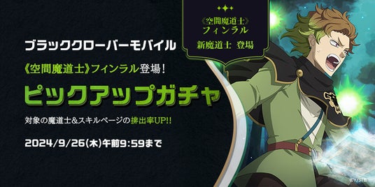 株式会社VIC GAME STUDIOS JAPAN(東京都新宿区、代表取締役:李 同校)は、テレビアニメ『ブラッククローバー』のアプリゲーム『ブラッククローバーモバイル 魔法帝への道 The Opening of Fate』(以下、ブラクロモ)において、本日9月12日(木)より、SSR魔道士「《空間魔道士》フィンラル」と魔道士スキルページ「空間魔道士の矜持」がピックアップガチャに新登場したことをお知らせいたします。