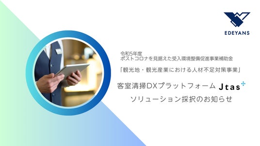 株式会社Edeyans(東京本社:東京都中央区、大阪本社:大阪市中央区、代表取締役:片山 裕之、以下「Edeyans」)は、Edeyansが提供する客室清掃DXプラットフォーム 「Jtas-ジェイタス-」(以下、「Jtas」)が、観光庁により公募される「令和5年度 ポストコロナを見据えた受入環境整備促進事業補助金」に係る「観光地・観光産業における人材不足対策事業」に採択されたことをお知らせします。