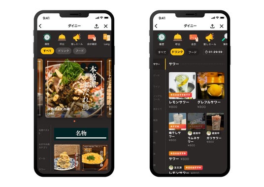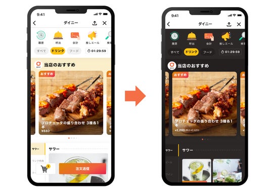 飲食店向けに提供している「ダイニーモバイルオーダー」、黒を基調とした「ダークテーマ」に対応