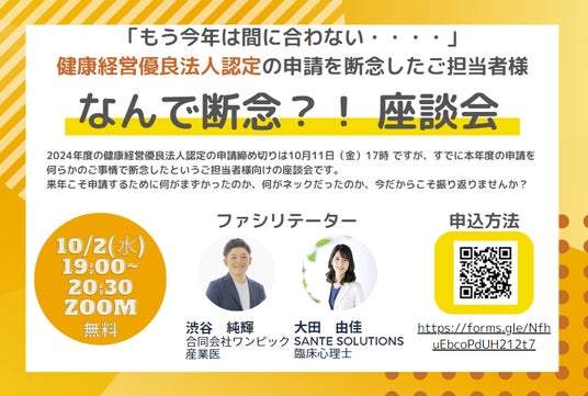 合同会社ワンピックは、2024年度の健康経営認定申請に間に合わなかった中小企業の人事担当者を対象とした無料イベント「なんで断念?!座談会」を10月2日に開催します。本イベントでは、2025年度の認定取得成功に向けた情報交換とノウハウ共有を行います。