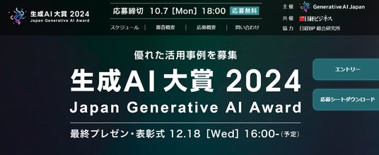 一般社団法人Generative AI Japan(所在地:東京都多摩市、代表理事:宮田 裕章、以下「GenAI〈読み:ジェナイ〉」)が、日経BP(本社:東京都港区、社長CEO:井口 哲也)が発行・運営する経済メディア「日経ビジネス」と共同で開催する「生成AI大賞2024」のエントリーの受付を本日より開始します。企業や団体の活用事例を募集中です。たくさんのご応募をお待ちしております。