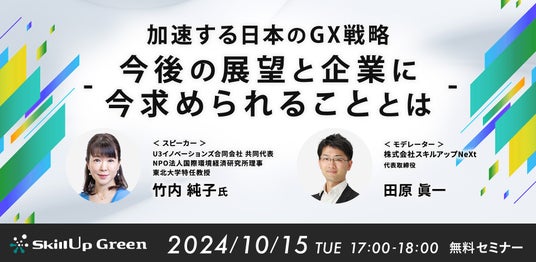 GX人材育成プログラム「スキルアップGreen」やGX検定を展開する株式会社スキルアップNeXt(東京都千代田区神田神保町2丁目40−5、代表取締役 田原 眞一)は、2024年10月15日(火)17:00-18:00に、オンラインセミナー「加速する日本のGX戦略 - 今後の展望と企業に今求められることとは -」を開催します。お申込みは次のURLより受け付けています。