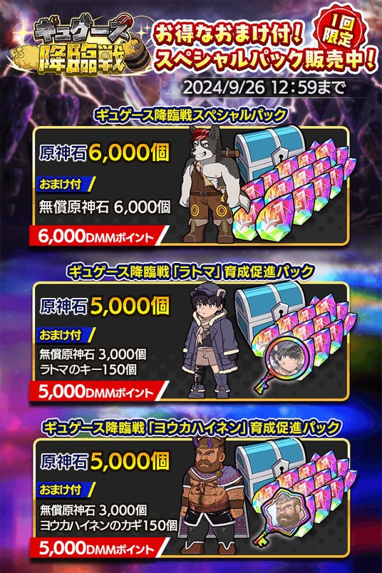 期間中、原神石がおトクに購入できる「ギュゲース降臨戦」各種パックが3種登場!