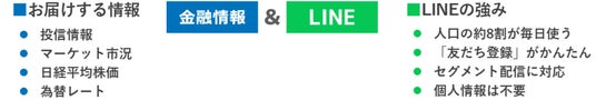 金融機関からお客様への効果的な「金融情報の提供」を運用の手間なく実現する、LINEを活用した情報配信サービスです。
