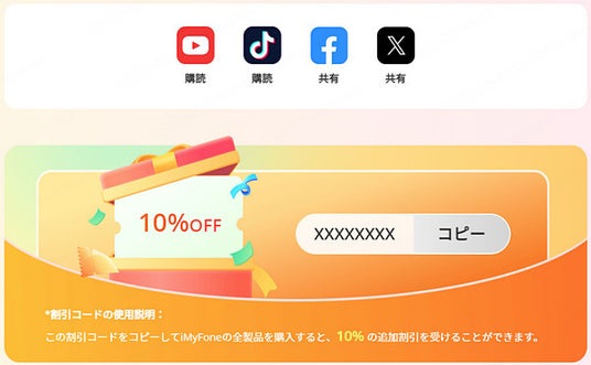 この活動のページにアクセスし、iMyFoneの公式チャンネルを購読するか、イベント活動をSNSに共有するとiMyFoneの全製品向けの 10% 割引クーポンを入手できます。