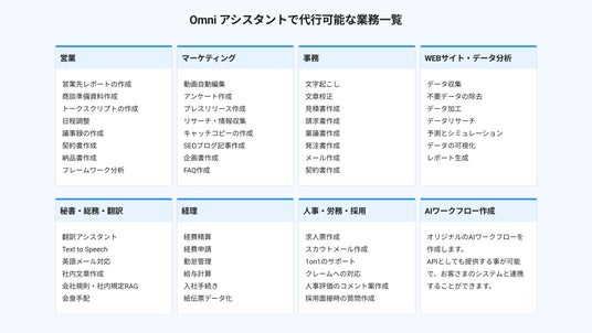 「Omni アシスタント」は、汎用的なAIワークフローBPaaSであり、企業の多様な業務プロセスを効率化するために設計されています。さらに、業界特化型のAIワークフローBPaaSも提供可能で、企業の具体的なニーズや業界に応じたカスタマイズが可能です。
