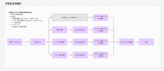 以下の図は、音声データを多言語に翻訳するAIワークフローの一例です。