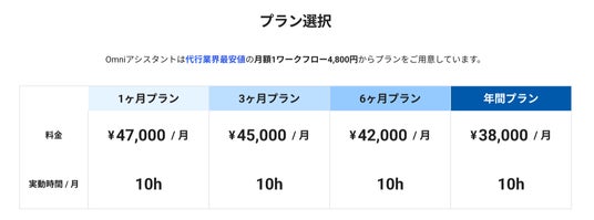 たとえば、1ヶ月プランは47,000円、3ヶ月プランは月額45,000円、6ヶ月プランは月額42,000円、そして年間プランは月額38,000円でご利用可能です。