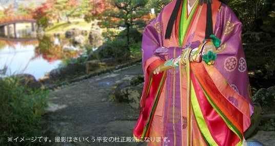 平安時代の文化体験として、明和観光商社が提供している「十二単着付け体験」を平安時代の役所跡・復元建物「さいくう平安の杜」にて実施します。