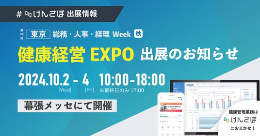 100円から始められる企業向け健康管理サービス「けんさぽ」を中心に、コストパフォーマンスに優れたヘルスケアサービスを開発・提供する株式会社Personal Health Tech(本社:大阪府大阪市、代表取締役:新田哲哉)は、2024年10月2日(水)~4日(金)の3日間幕張メッセにて行われる『第5回 健康経営 EXPO』に出展いたします。