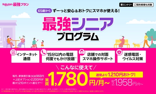 楽天モバイル株式会社(以下「楽天モバイル」)は、2024年9月13日(金)より、「最強シニアプログラム」(以下「本プログラム」)の提供を開始します(注1、2)。本プログラムは、「Rakuten最強プラン」をご契約している65歳以上のお客様に「楽天ポイント」110ポイントを毎月還元します。また、本プログラムの利用者は、通常合計2,000円(税込2,200円)のシニアのお客様が安心してスマホを利用できる4つのオプションサービスがパックになった「15分かけ放題&安心パック」を、毎月1,100ポイントの還元により実質月額1,000円(税込1,100円)でご利用いただけます(注3、4、5、6)。