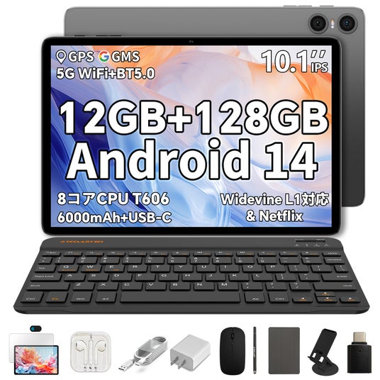 タブレット本体、Bluetoothキーボード、ワイヤレスマウス、保護ケース、タブレットスタンド、ヘッドフォン、充電器、Type-C充電ケーブル、タッチペン、OTGアダプター、保護フィルム、SDカード取り出しピン、日本語説明書。