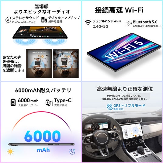 6000mAhの大容量リチウムバッテリと低消費電力プロセッサにより、最長7時間の動画視聴が可能です。Type-Cインターフェースは、どちら向きでも挿入可能で、充電がより便利になります。4つの主要衛星測位システム(BeiDou、GPS、GLONASS、GALILEO)をサポートし、世界の大部分をカバーしています。A-GPSネットワーク・アシスト測位と組み合わせて、高精度ナビを提供します。