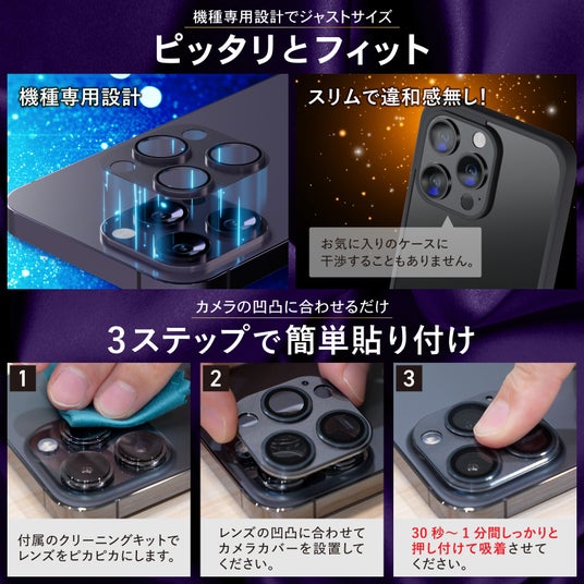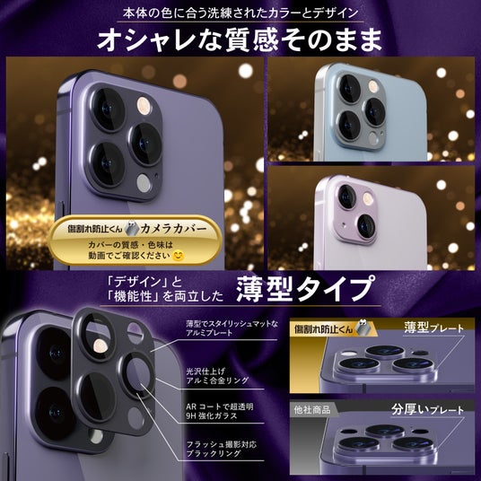 同シリーズのユーザーからの評判はよく、高級感のあるカラーアルマイト加工されたアルミ合金は、本体の質感に馴染むので、スタイリッシュさを損ないません。プレート部分が薄型設計なので、ピッタリフィットしケースへの干渉も無し!レンズ部分は透過率が高く硬度9Hの強化ガラス仕様。