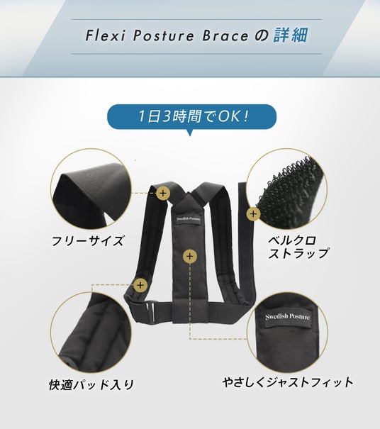 『Flexi Posture Brace』は、1日わずか3時間の着用で無意識のうちに正しい姿勢を習慣化させる画期的な姿勢サポーターです。