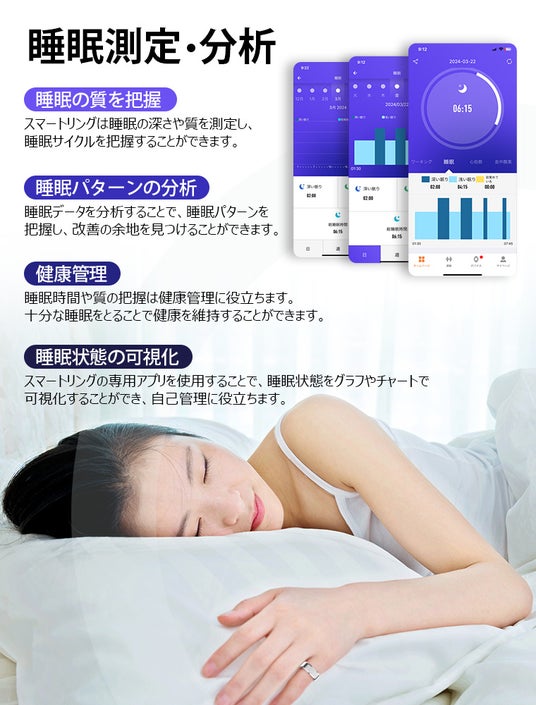 スマートリングは、日々の健康を管理するための様々な機能を搭載しています。睡眠測定、心拍数測定、血中酸素飽和度のモニタリングが可能で、これによりユーザーは自分の健康状態を詳細に把握できます。特に睡眠の質を管理する機能は、日常のストレス軽減や生活の質の向上に寄与します。