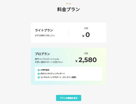 Prop Dockは、ライトプランとプロプランを設定しており、ライトプランは自分の不動産運用状況を把握したい人向けの無料プランで、プロプランはAI査定をしたりコンサルタントを担当につけて運用全般見直したい人におすすめです。