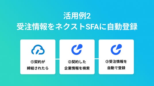 クラウドサインなどの電子契約サービスで契約締結が完了したら、ネクストSFAで該当企業を検索して、受注情報を自動登録するフローです。受注情報入力作業の自動化により営業担当者はより多くの時間を他の重要な業務に割り当てることができ、生産性の向上が期待できます。