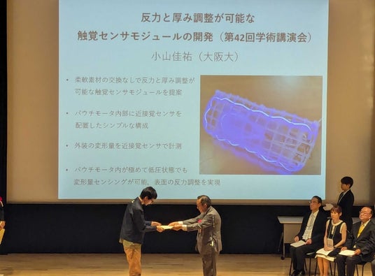 “指先で考えるロボットハンド”で製造現場の革新に取り組む株式会社Thinker(読み:シンカー、本社:大阪府大阪市、代表取締役兼CEO:藤本弘道、以下Thinker)の取締役であり、大阪大学基礎工学研究科助教である小山佳祐が、日本ロボット学会(※1)2024年度表彰において、「優秀講演賞」を受賞しました。日本ロボット学会の「優秀講演賞」は、ロボット分野の発展への貢献奨励を目的としたもので、前年度の学術講演会で発表された講演の中から特に優れた講演発表が選ばれ、その講演者に贈呈されます。