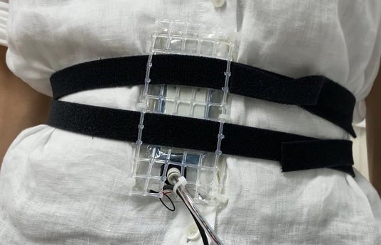 締め付け度合いを計測するモジュールがベルトで固定された様子