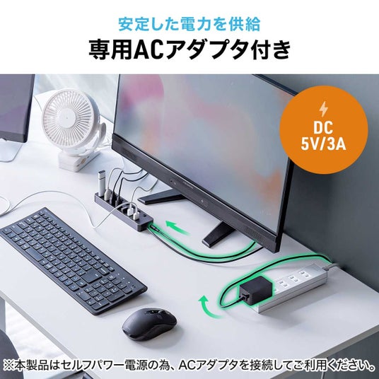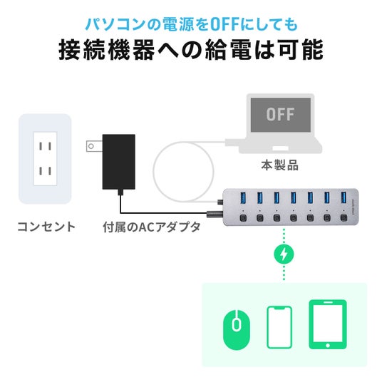 セルフパワー対応でACアダプタを使用するため、USBハブに安定した電源供給が可能です。これにより、ポータブルHDDなどの電力を多く必要とする機器も安心して使用できます。PCの電源がOFFの時でも給電が可能です。
