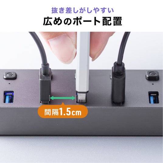 セルフパワーのため、コンセントから給電をする必要がありますが、ACアダプタのケーブル長が約1.2mあるため、余裕をもって配線することが可能です。また、USBハブのポートとポートの間隔も約1.5cmで抜き差しがしやすく、扱いやすい商品です。