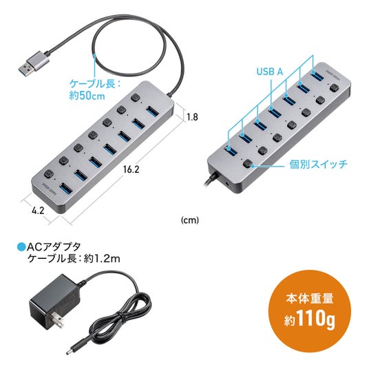 ・USBハブ 7ポート ACアダプタ付 USB充電器 セルフパワー 個別スイッチ付 USB3.2/5Gbps コンパクト USB A 接続 グレー 400-HUBA32GM