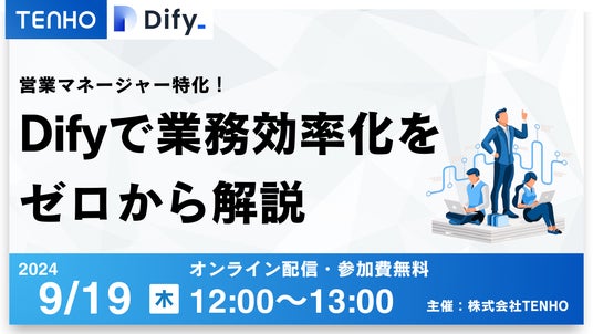 生成AIに関する研修事業を展開する株式会社TENHO(本社:東京都渋谷区、代表取締役:田村 允)は、2024年9月19日(木)12:00~13:00に第3回無料ウェビナー「【営業マネージャー向け】ゼロからDifyで業務を効率化する方法」を開催します。営業チームの生産性を劇的に向上させたい営業マネージャーに向けた内容で、営業マネジメントに特化したDify活用方法を徹底解説します。今回も前回同様、デジタルシティ株式会社(本社:東京都渋谷区、代表取締役:大島 予章)との共催になります。