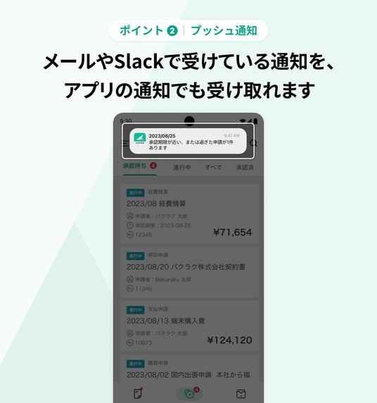 メールやSlackで受けている通知をアプリでも受け取れます。申請し忘れているものや承認期限が近いものは通知が来るようになっているので、申請忘れや承認忘れも防げます。