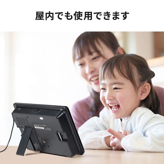 電源は、シガーソケットとAC電源から給電できるので、屋内でも動画を楽しめます。また、背面のスタンドを使えば机の上に設置ができます。