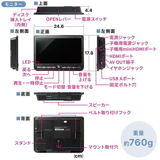 DVDはもちろん、HDMIとUSB Aの入力ポートが付いているため、スマホやUSBメモリ内の動画や音楽、画像を再生することができます。