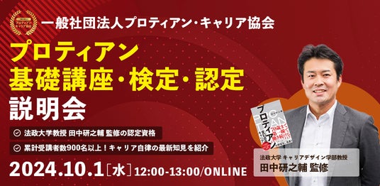 一般社団法人プロティアン・キャリア協会(東京都新宿区、代表理事:田中研之輔・有山徹、以下「当協会」)は、組織と個人のより良い関係構築と個人の主体的なキャリア開発を支援する団体です。プロティアン・キャリア理論をベースにプロティアン・キャリア基礎講座を2024年10月12日、プロティアン・キャリア検定を11月3日に実施します。