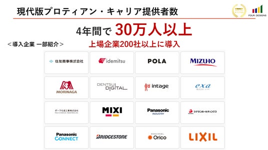 設立から4年で現代版プロティアン・キャリア理論を約30万人・上場企業を含めた約200社以上に届けてきました。キャリアコンサルタント・人事の方をはじめ、自らのキャリア・人生を戦略的に考えたいという方に、多く受講いただいております。