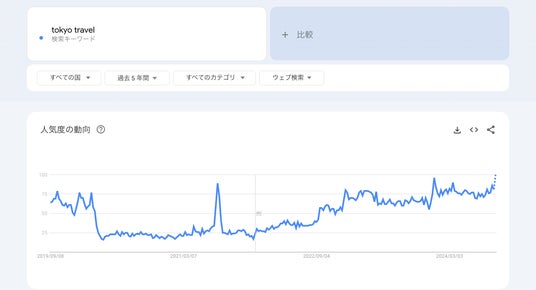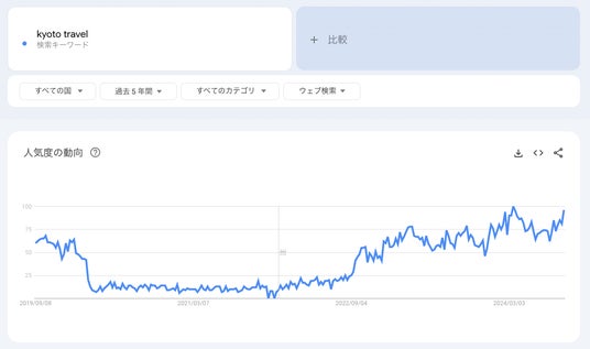 国土交通省の調査によると、2023年の訪日外国人旅行者の数は2,507万人にのぼりました。Googleトレンドで「Tokyo travel(東京 旅行)」「Kyoto travel(京都 トラベル)」を調べてみても、過去5年間でみても最高水準クラスの検索ボリュームとなっています。