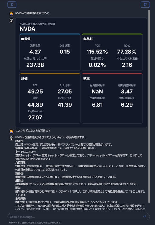 生成AI財務諸表のデータを基に学習した生成AIを活用しています。それに加え、現在の株価や有名投資家のポートフォリオ、アナリストたちの企業レーティングなど、幅広い情報を提供します。