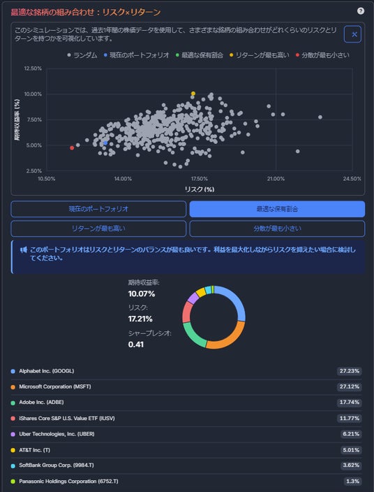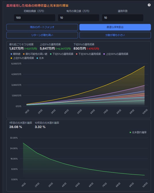 最適化されたポートフォリオを長期に運用した場合の期待運用成績や元本割れ確率もシミュレーションできます。