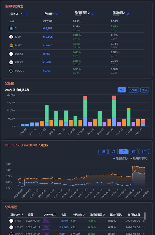 ポートフォリオ全体の利回りの推移を視覚化し、配当収益の成長を直感的に把握できるように設計しています。(*2)