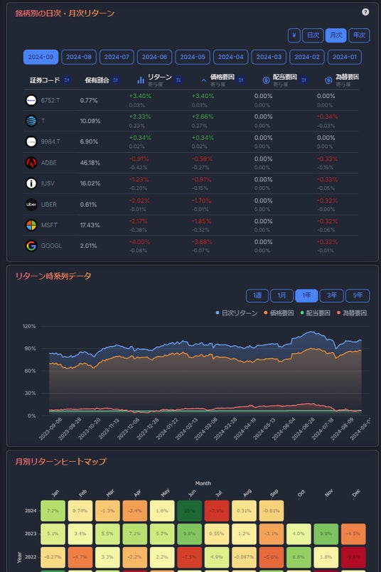 リターン保有資産のリターンを、値上がり、配当、そして為替変動といった要因別に分析できます。(*5)