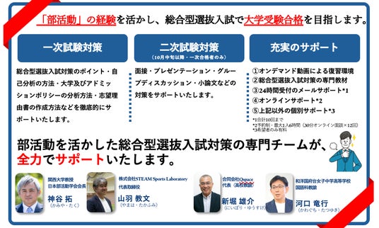株式会社STEAM Sports Laboratory(東京都港区/代表取締役 山羽教文)は、部活動支援プラットフォーム「コーチクエスト」を活用した新しい有償個別支援サービス“コーチクエスト総合型選抜入試対策プログラム(URL: https://uee.coachquest.ne.jp/) を開始いたします。本サービスは、生徒一人ひとりの学びの旅(プロセス)に寄り添い、大学入試やその後のキャリア形成に向けたパーソナライズドなサポートを提供します。
